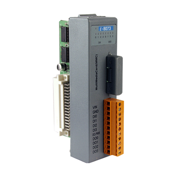 I-8073 oferuje urządzenie pamięci masowej MultiMediaCard, 4 kanały wejść cyfrowych, 4 kanały wyjść cyfrowych oraz 1 kanał wejścia analogowego. I-8073 zawiera 8 wskaźników LED do monitorowania statusu wejść i wyjść cyfrowych.Główne cechy