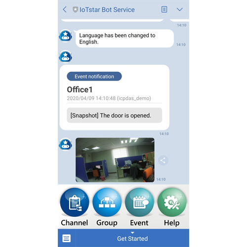 Ponadto IoTstar Bot Service może odbierać wiadomości tekstowe wysyłane przez kontrolery WISE/PMC/PMD na podstawie logiki reguł IF-THEN-ELSE i wysyłać wiadomości tekstowe na konto LINE powiązane z czatem LINE w celu powiadomienia o zdarzeniu. Jeśli WISE jest podłączony do kamery IP iCAM firmy ICP DAS, IoTstar Bot Service może również wysyłać pliki zdjęć lub wideo na konto LINE wraz z wiadomością tekstową, a użytkownik może również przeglądać listę zdarzeń oraz odpowiadające im obrazy kontrolera z przeszłości.