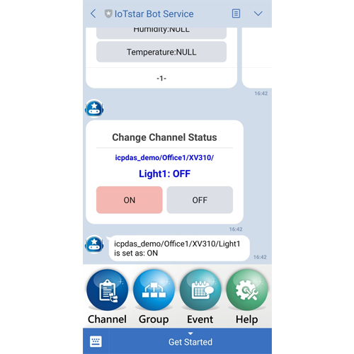 IoTstar zapewnia interfejs internetowy do monitorowania w czasie rzeczywistym zdalnych kontrolerów WISE/PMC/PMD podłączonych do serwera IoTstar. IoTstar Bot Service może bezpośrednio uzyskiwać dostęp do danych kanałów I/O kontrolerów wewnątrz bazy danych zbudowanej przez IoTstar, a następnie użytkownicy mogą monitorować i kontrolować te zdalne kontrolery WISE/PMC/PMD za pomocą aplikacji LINE; zapewnia to łatwiejszy i bardziej wygodny mechanizm zarządzania zdalnymi urządzeniami.