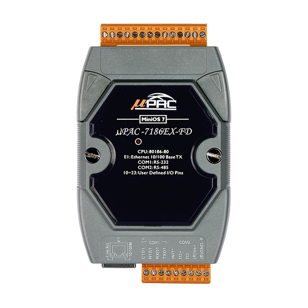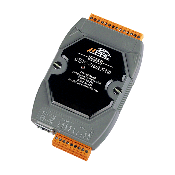 uPAC-7186EX-FD to programowalny kontroler automatyki w rozmiarze dłoni, wyposażony w interfejsy komunikacyjne RS-232/485 i Ethernet. ICP DAS dostarcza łatwe w użyciu zestawy narzędzi do tworzenia oprogramowania (MiniOS7 framework, biblioteki Modbus). Użytkownicy mogą z łatwością integrować urządzenia szeregowe, aby uzyskać możliwość komunikacji Ethernet/Internet oraz komunikować się z oprogramowaniem SCADA (Indusoft, ISaGARF, DasyLab, Trace Mode, Citect, iFix itp.) poprzez standardowy protokół Modbus.