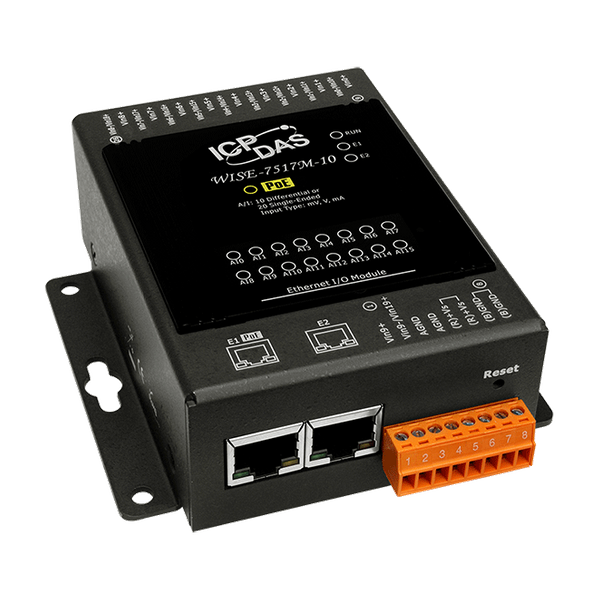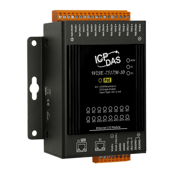 WISE-7517M-10 to moduł z 10-kanałowymi różnicowymi lub 20-kanałowymi jednobiegunowymi wejściami analogowymi. Zapewnia możliwość programowania zakresu wejściowego na wszystkich kanałach analogowych. Każdy kanał analogowy ma ochronę przed przepięciami do 240 Vrms. Każde wejście analogowe można zaprogramować do akceptacji napięcia lub prądu jako wejścia, w zależności od pozycji odpowiedniego zworka. Moduł posiada również 4 kV ochronę ESD oraz 3000 VDC izolację między modułami. WISE-7517M-10 jest zgodny ze specyfikacją Power over Ethernet (PoE) IEEE 802.3af. Umożliwia odbieranie zasilania z sieci PoE za pomocą par Ethernet. Ponadto, WISE-7517M-10 posiada wbudowany dwuporotowy przełącznik Ethernet do implementacji topologii daisy-chain. Oznacza to łatwiejsze okablowanie i znaczne zmniejszenie całkowitych kosztów okablowania i przełączników.