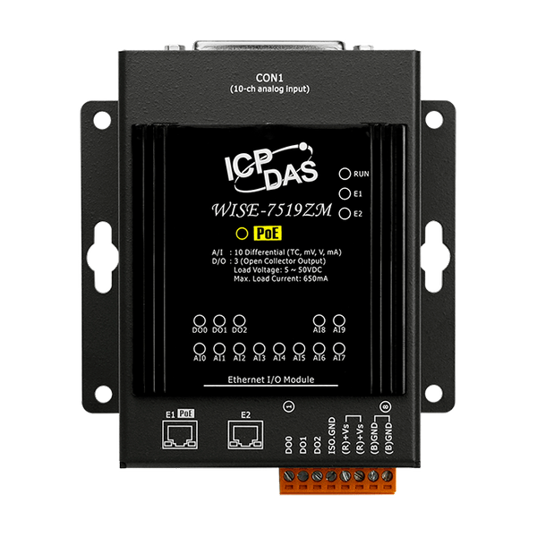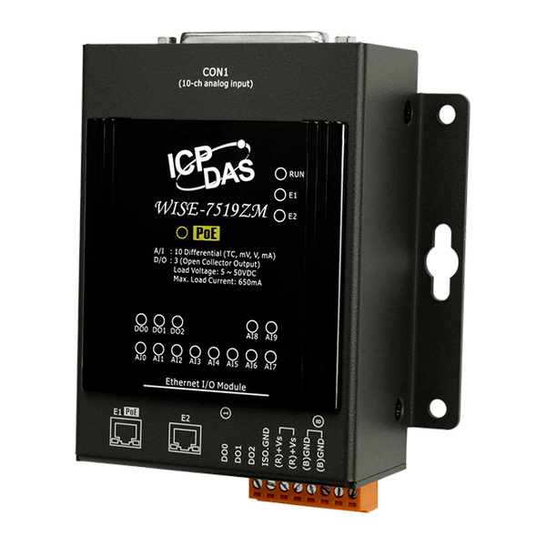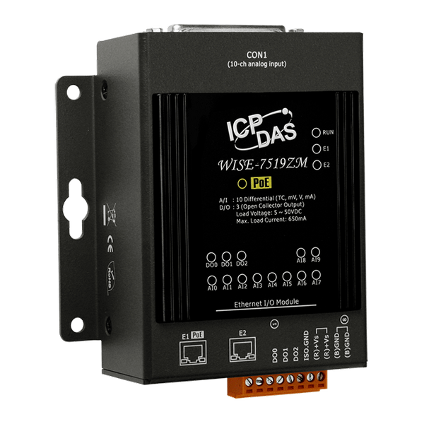WISE-7519ZM/S został specjalnie zaprojektowany do niezwykle precyzyjnego pomiaru termoelementów i posiada automatyczną kompensację złącza zimnego dla każdego kanału, zapewniając jednorodność wyjścia temperatury i stabilność pomiarów w terenie. Obsługiwane są zarówno wejścia prądowe, jak i napięciowe. Wbudowane mechanizmy wykrywania otwartych termoelementów oraz ochrona przed ESD/ EFT/ Surge. Trzy kanały wyjścia cyfrowego mogą być ustawione jako wyjścia alarmowe. WISE-7519ZM/S jest zgodny ze specyfikacją Power over Ethernet (PoE) IEEE 802.3af. Umożliwia odbieranie zasilania z sieci PoE przez pary Ethernet. Ponadto, WISE-7519ZM/S posiada wbudowany przełącznik Ethernetowy dwupasmowy do realizacji topologii łańcuszkowej. Okablowanie jest znacznie łatwiejsze, a całkowite koszty przewodów i przełączników są znacząco obniżone.
