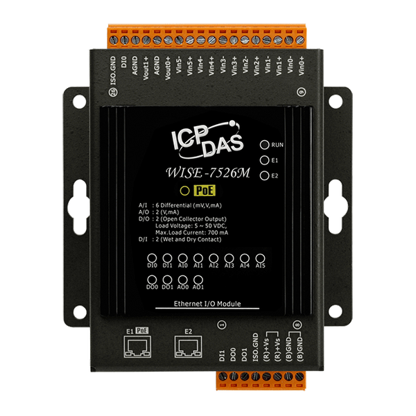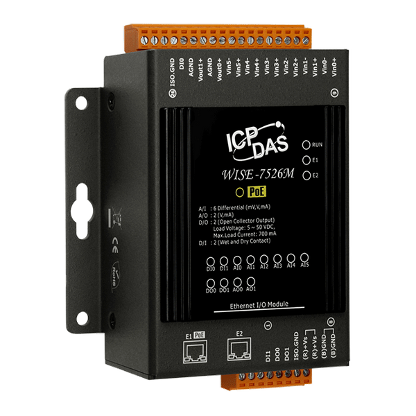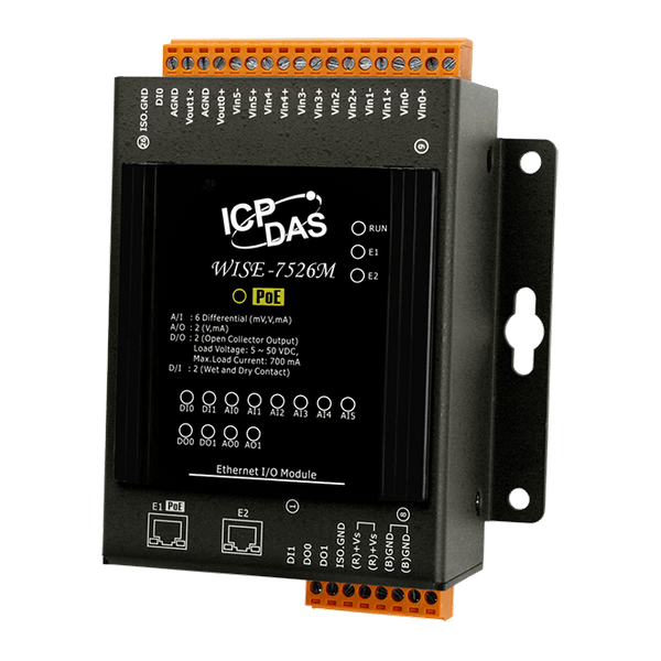 WISE-7526M jest modułem wielofunkcyjnym z 6-kanałowymi wejściami analogowymi, 2-kanałowymi wyjściami analogowymi, 2-kanałowymi wejściami cyfrowymi i 2-kanałowymi wyjściami cyfrowymi. Oferuje różne programowalne wejścia i wyjścia analogowe. Każde wejście analogowe można skonfigurować do odpowiedniego zakresu z wysoką ochroną przed napięciami 240 Vrms. WISE-7526M jest zgodny ze specyfikacją IEEE 802.3af Power over Ethernet (PoE). Umożliwia odbieranie zasilania z sieci PoE przez pary Ethernet. Dodatkowo, WISE-7526M ma wbudowany przełącznik Ethernet z dwoma portami, co pozwala na realizację topologii Daisy-Chain. Okablowanie jest znacznie łatwiejsze, a całkowite koszty kabli i przełączników są znacząco zredukowane.