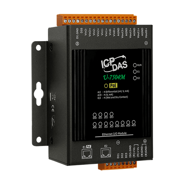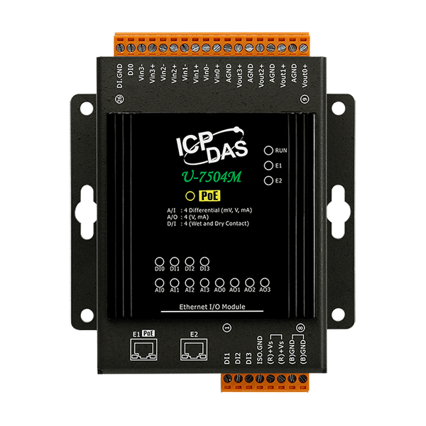 U-7504M to moduł UA I/O, który zapewnia 4 wejścia cyfrowe, 4 wejścia analogowe oraz 4 wyjścia analogowe. Posiada wbudowany przełącznik Ethernet z dwoma portami, umożliwiający realizację topologii łańcuchowej (daisy-chain). Okablowanie jest znacznie prostsze i może redukować całkowity koszt kabli i przełączników. Moduł jest zgodny ze specyfikacją Power over Ethernet (PoE) IEEE 802.3af (klasa 2). Umożliwia odbieranie zasilania z sieci PoE przez pary Ethernet. Ta funkcja zapewnia większą elastyczność i efektywność, upraszczając projekt systemu, oszczędzając miejsce oraz redukując okablowanie i gniazda zasilania. Moduł oferuje interfejs webowy do konfigurowania, kontrolowania i monitorowania modułów, połączeń oraz statusu I/O przez przeglądarkę internetową. Jest to łatwe, szybkie i nie wymaga dodatkowych aplikacji.