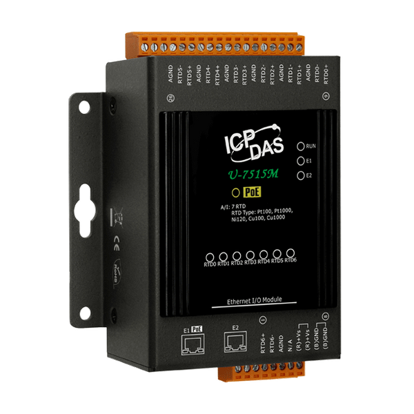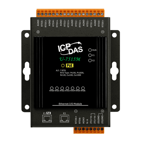 U-7515M to moduł UA I/O, który zapewnia 7 kanałów wejściowych RTD. Posiada wbudowany przełącznik