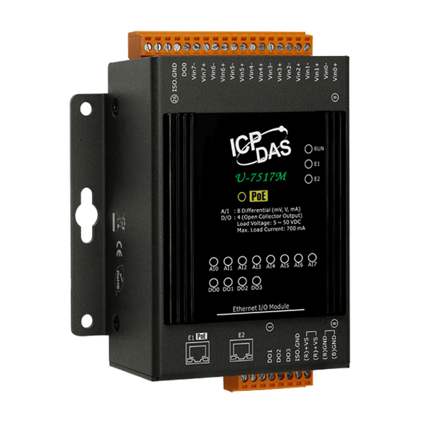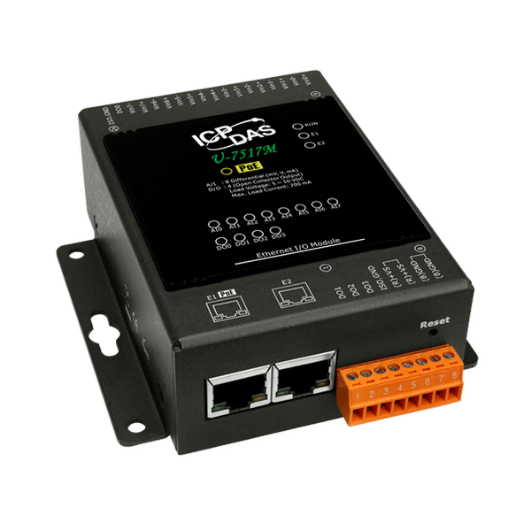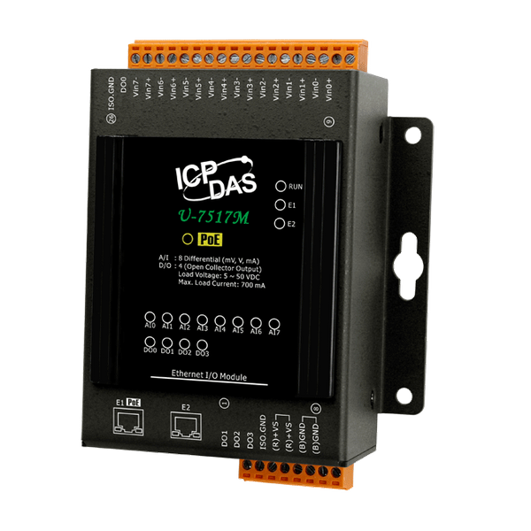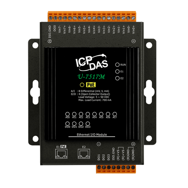 U-7517M to moduł UA I/O, który oferuje 8 kanałów wejść analogowych oraz 4 kanały wyjść cyfrowych. Posiada wbudowany przełącznik Ethernet z podwójnym portem, umożliwiający realizację topologii łańcuchowej. Okablowanie jest znacznie prostsze i pozwala zredukować całkowite koszty kabli i przełączników. Moduł jest zgodny ze standardem IEEE 802.3af (klasa 2) Power over Ethernet (PoE). Umożliwia zasilanie przez sieć Ethernet. Ta funkcja zapewnia większą elastyczność, upraszcza projektowanie systemu, oszczędza miejsce oraz redukuje ilość okablowania i gniazdek zasilających. Moduł posiada interfejs webowy do konfigurowania, kontrolowania i monitorowania modułów, połączeń oraz statusu I/O przez przeglądarkę internetową. Jest to proste, szybkie i nie wymaga dodatkowych aplikacji.