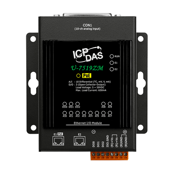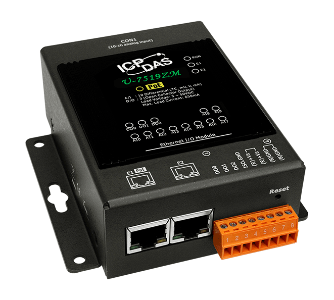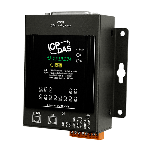 U-7519ZM/S2 to moduł UA I/O, który oferuje 3 kanały wyjściowe cyfrowe i 10 kanałów wejściowych analogowych. Wbudowany przełącznik Ethernet z dwoma portami umożliwia realizację topologii daisy-chain. Okablowanie jest znacznie łatwiejsze i pozwala zmniejszyć całkowity koszt okablowania i przełączników. U-7519ZM przestrzega specyfikacji Power over Ethernet (PoE) zgodnej z IEEE 802.3af (klasa 2). Pozwala to na zasilanie z sieci PoE za pomocą par Ethernetowych. Ta funkcja zapewnia większą elastyczność i efektywność, upraszcza projektowanie systemu, oszczędza miejsce oraz redukuje liczbę przewodów i gniazdek zasilania. Moduł zapewnia interfejs Web UI do konfigurowania, kontrolowania i monitorowania modułów, połączeń i statusu I/O za pomocą przeglądarki internetowej. Jest to proste, szybkie i nie wymaga dodatkowych aplikacji.