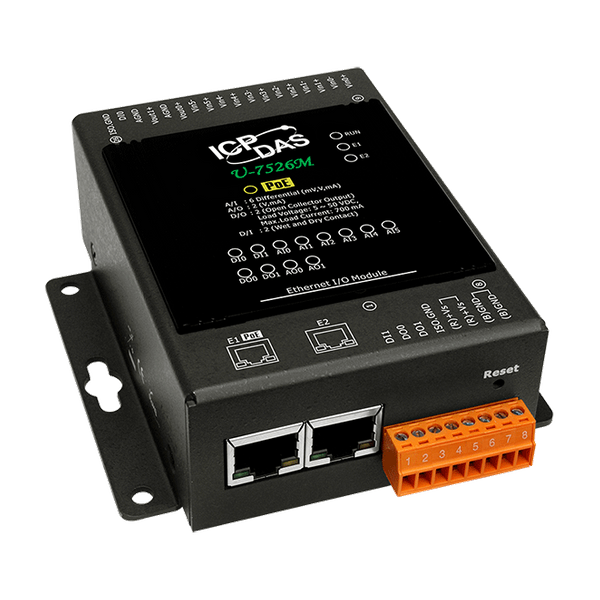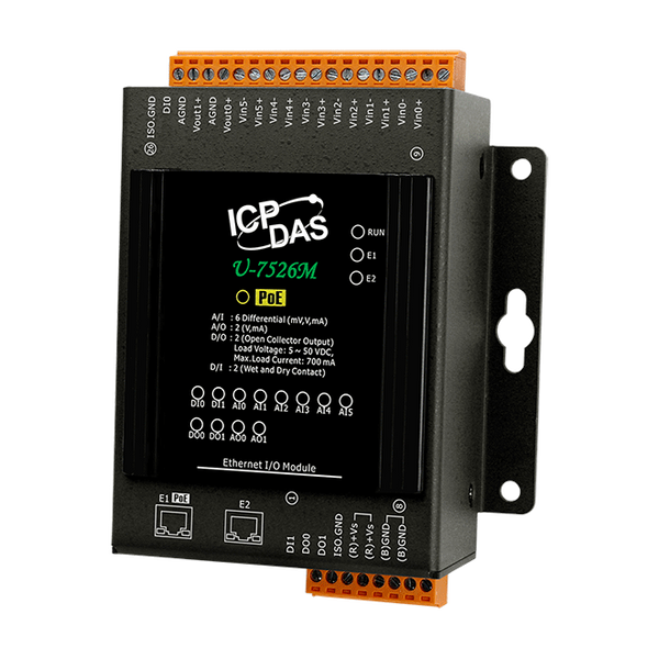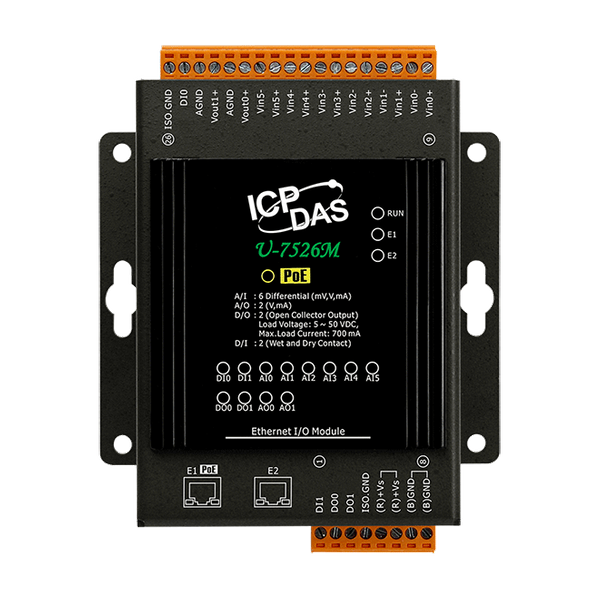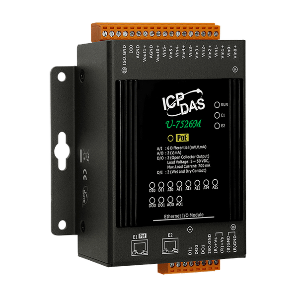 U-7526M to moduł wejść/wyjść UA, który oferuje 2 kanały wejść cyfrowych, 2 kanały wyjść cyfrowych, 6 kanałów wejść analogowych oraz 2 kanały wyjść analogowych. Moduł ma wbudowany dwupasmowy przełącznik Ethernetowy umożliwiający implementację topologii łańcuchowej, co znacznie upraszcza połączenia kablowe oraz redukuje koszty kabli i przełączników. Urządzenie jest zgodne z specyfikacją Power over Ethernet (PoE) według normy IEEE 802.3af (Klasa 2). Umożliwia zasilanie z sieci Ethernet za pomocą pary przewodów Ethernetowych, co zapewnia większą elastyczność i efektywność, upraszczając projekt systemu, oszczędzając miejsce oraz redukując ilość kabli i gniazdek zasilających. Moduł oferuje interfejs użytkownika WWW do konfigurowania, kontrolowania i monitorowania modułów, połączeń oraz statusu I/O za pomocą przeglądarki internetowej, co jest łatwe, szybkie i nie wymaga dodatkowych aplikacji.