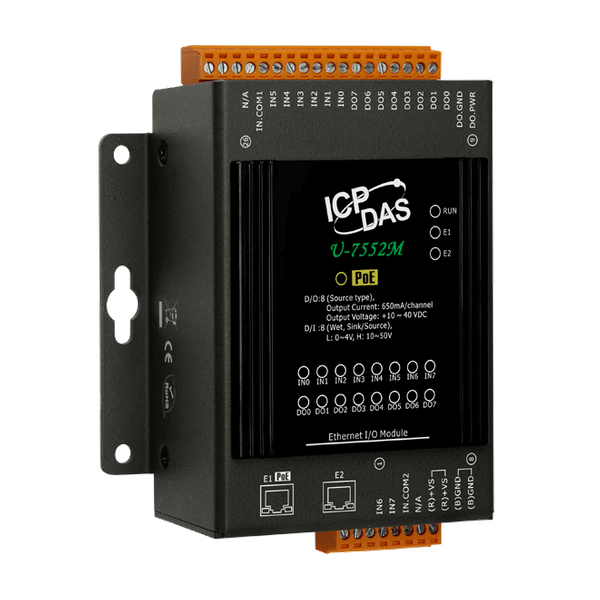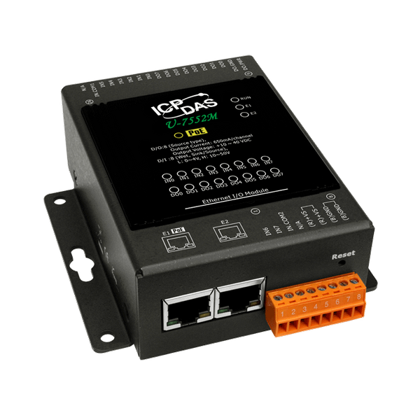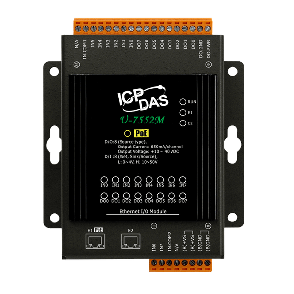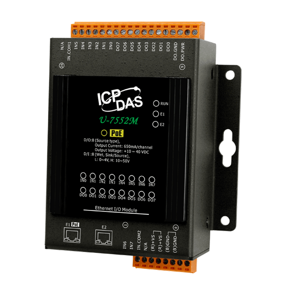 U-7552M to moduł UA I/O, który zapewnia 8 kanałów wejść cyfrowych i 8 kanałów wyjść cyfrowych. Posiada wbudowany dwuportowy przełącznik Ethernet do realizacji topologii łańcuchowej daisy-chain. Okablowanie jest znacznie łatwiejsze i może obniżyć całkowity koszt kabli i przełączników. Moduł jest zgodny z normą IEEE 802.3af (klasa 2) dotyczącą zasilania przez Ethernet (PoE). Pozwala to na zasilanie z sieci obsługującej PoE za pomocą pary przewodów Ethernet. Ta funkcjonalność zapewnia większą elastyczność i efektywność, co upraszcza projektowanie systemu, oszczędza miejsce oraz redukuje ilość okablowania i gniazdek zasilających. Moduł zapewnia interfejs webowy do konfigurowania, kontrolowania i monitorowania modułów, połączeń oraz statusu I/O za pomocą przeglądarki internetowej. Jest to łatwe, szybkie i nie wymaga dodatkowej aplikacji.