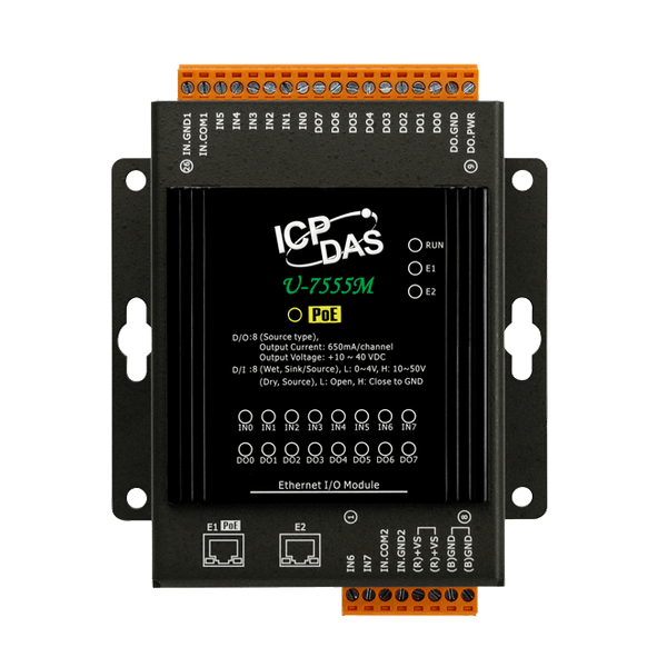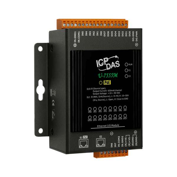 U-7555M to moduł I/O OPC UA, który oferuje 8 kanałów wejścia cyfrowego i 8 kanałów wyjścia cyfrowego. Posiada wbudowany dwuporotowy przełącznik Ethernet do implementacji topologii daisy-chain. Okablowanie jest znacznie prostsze, co pozwala na zredukowanie kosztów kabli i przełączników. Spełnia specyfikację IEEE 802.3af (Class 2) dotyczącą Power over Ethernet (PoE). Umożliwia pobieranie zasilania z sieci PoE za pomocą par Ethernet. Ta funkcja zapewnia większą elastyczność i wydajność, upraszczając projektowanie systemu, oszczędzając miejsce i redukując okablowanie oraz gniazda zasilania. Moduł oferuje interfejs WWW do konfiguracji, kontroli i monitorowania modułów, połączeń oraz statusu I/O poprzez przeglądarkę internetową. Jest to łatwe, szybkie i nie wymaga dodatkowych aplikacji.