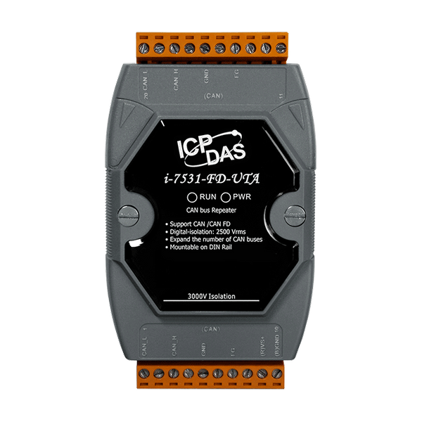I-7531-FD-UTA jest wzmacniaczem sygnału CAN/CAN FD, który może łączyć dwie lub więcej sieci CAN o tej samej prędkości transmisji i ma szerszy zakres temperatur pracy niż I-7531-FD. Dzięki funkcji powtarzania sygnału w I-7531-FD-UTA użytkownicy mogą używać różnych liczby I-7531-FD-UTA do tworzenia topologii sieci CAN w kształcie drzewa lub gwiazdy. Gdy w sieci CAN jest zbyt wiele urządzeń, użycie I-7531-FD-UTA może zwiększyć siłę sygnału CAN, by obsługiwać więcej urządzeń CAN. Dodatkowo, strona CAN w I-7531-FD-UTA posiada cyfrową izolację o wartości 2500 Vrms, a zarówno strona CAN, jak i strona zasilania posiadają ochronę izolacyjną 3000 V DC-DC, co skutecznie izoluje zakłócenia między sieciami CAN, osiągając cel ochrony konkretnej sieci CAN.