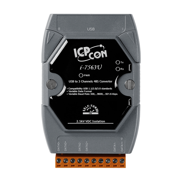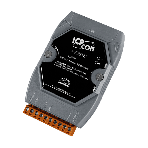 I-7563U to opłacalny moduł do transferu danych szeregowych przez USB. Pozwala na podłączenie urządzeń szeregowych do systemów korzystających z interfejsu USB. Po podłączeniu I-7563U do komputera uzyskujemy jeden port COM w systemie. I-7563U zawiera "Self-Tuner", który automatycznie dostosowuje szybkość transmisji i format danych do sieci RS-485. Moduł I-7563U jest zasilany z portu USB, więc nie potrzebuje zasilacza.