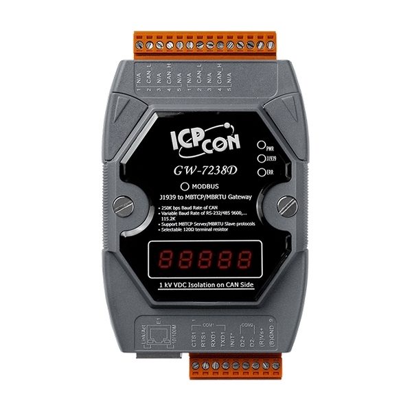 GW-7238D to bramka zapewniająca konwersję między protokołem J1939 a Modbus TCP/RTU. W sieci J1939 GW-7238D obsługuje wiadomości typu PDU1, PDU2, broadcast i specyficzne dla docelowych odbiorców. W sieci Modbus TCP/RTU, GW-7238D działa jako serwer Modbus TCP / slave RTU odpowiadający na żądania klienta Modbus TCP / master RTU. Program narzędziowy jest dostarczany użytkownikom do konfigurowania ustawień J1939 i Modbus TCP/RTU w GW-7238D. Dziedzinami zastosowania mogą być aplikacje związane z silnikami Diesla, sieci pojazdowe dla ciężarówek i autobusów itp.