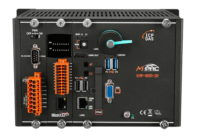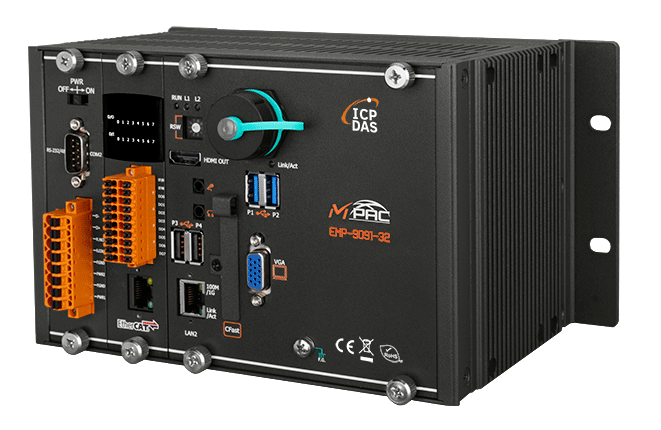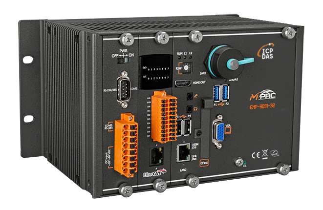 EMP-9091-32 to PAC oparty na Windows 10 IoT z preinstalowanym EtherCAT Master. Łączy w sobie funkcje obliczeniowe, I/O i interfejs operatora w jednym urządzeniu, zapewniając doskonałe rozwiązanie do integracji HMI, akwizycji danych i sterowania w jednym PAC. Jest wyposażony w procesor Intel Atom E3950 oraz różnorodne złącza, w tym dwa Gigabit Ethernet, VGA, port USB, interfejs RS-232 i RS-485.