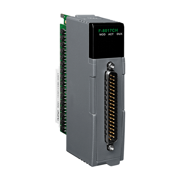 F-8017CH to 16-bitowy, 8-kanałowy moduł różnicowego wejścia analogowego. Moduł ten akceptuje zakres wejściowy prądu 4~20mA i wspiera pomiary zakresu przekroczenia o 25% (dokładność nie jest gwarantowana). Ponadto, posiada dokładność ±0.05% dla bardzo wymagających aplikacji. Co więcej, moduł ten zapewnia częstotliwość próbkowania 500Hz dla niektórych zastosowań. Oprócz wejścia prądowego, F-8017CH ma wbudowany interfejs główny HART, umożliwiający zdalne utrzymanie urządzeń poprzez HART. F-8017CH zapewnia izolację optyczną 3000 VDC między kanałami a magistralą, co chroni inne komponenty systemu iDCS-8000 w przypadku uszkodzenia kanałów przez wysokie napięcie lub prąd.