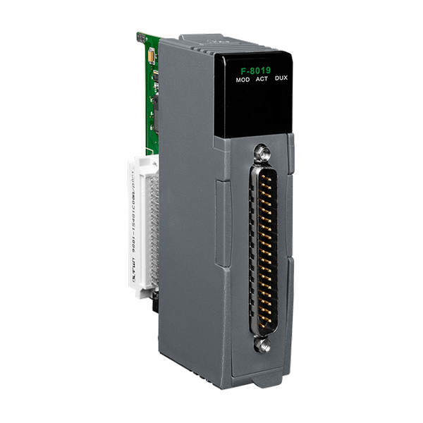 Moduł F-8019 to 16-bitowy, 8-kanałowy moduł wejściowy termopary z programowalnym zakresem wejściowym na wszystkich kanałach. Mierzy wejścia miliwoltowe (±15mV, ±50mV, ±100mV, ±150mV, ±500mV), wejścia napięciowe (±1V, ±2.5V, ±5V, ±10V) oraz wejścia termoparowe (Typ J, K, T, E, R, S, B, N, C). Obsługuje zewnętrzny CJC dla dokładnych pomiarów temperatury. Ponadto, moduł ten charakteryzuje się dokładnością ±0.05% dla niezwykle precyzyjnych zastosowań. Dodatkowo, F-8019 zapewnia izolację optyczną 3000 VDC pomiędzy kanałami a magistralą. Jeśli jakiekolwiek wysokie napięcie lub prąd uszkodzą te kanały, moduł nie wpłynie na inne komponenty systemu iDCS-8000.