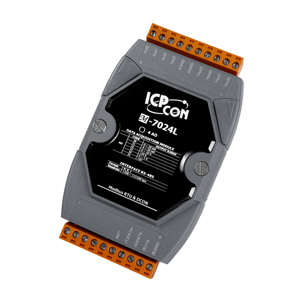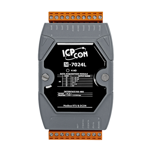 M-7024L to 12-bitowy, 4-kanałowy moduł wyjść analogowych, który dostarcza wyjścia prądowe i napięciowe. Moduł posiada izolację wewnętrzną o wartości 3000 VDC. M-7024L obsługuje protokoły Modbus RTU i DCON, które można skonfigurować za pomocą oprogramowania. Istnieją również opcje konfigurowania wartości początkowej i bezpiecznej.