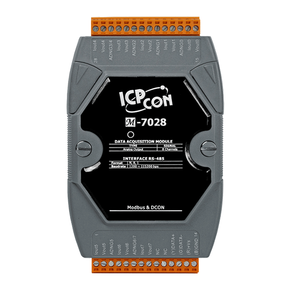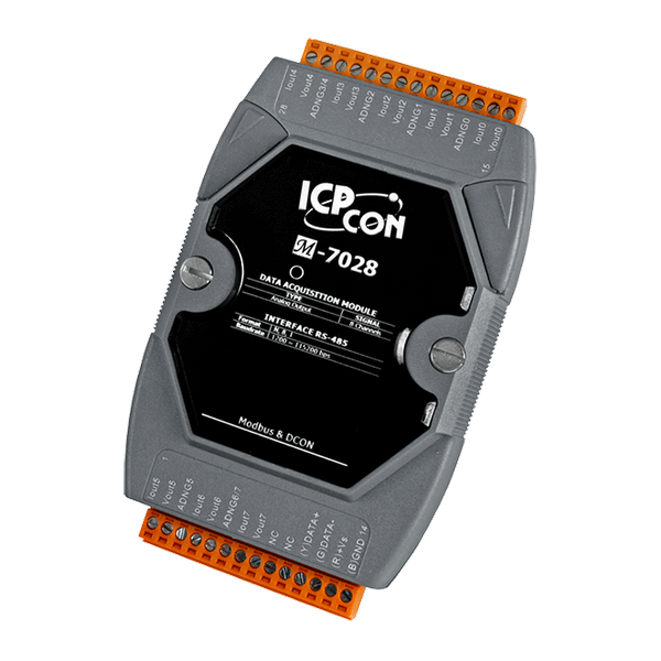 M-7028/M-7028D to 12-bitowy moduł wyjścia analogowego z 8 kanałami i 8 diodami LED do monitorowania statusu kanałów. Zapewnia programowalny zakres wyjścia na wszystkich kanałach analogowych (0 ~ 5 V, ±5 V, 0 ~ 10 V, ±10 V, 0 ~ +20 mA lub +4 ~ +20 mA). Każdy kanał wyjścia analogowego można skonfigurować indywidualnie. Moduł posiada również wykrywanie przerwania obwodu na kanale +4 ~ +20 mA oraz ochronę przed ESD 8 kV i izolację wewnętrzną 3000 VDC. M-7028(D) obsługuje protokoły Modbus RTU i DCON, które można konfigurować za pomocą oprogramowania. Istnieją również opcje konfigurowania wartości początkowych i bezpiecznych wartości.