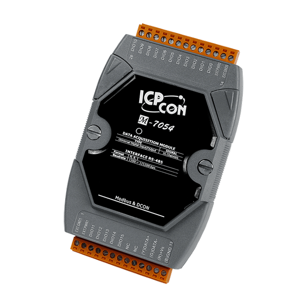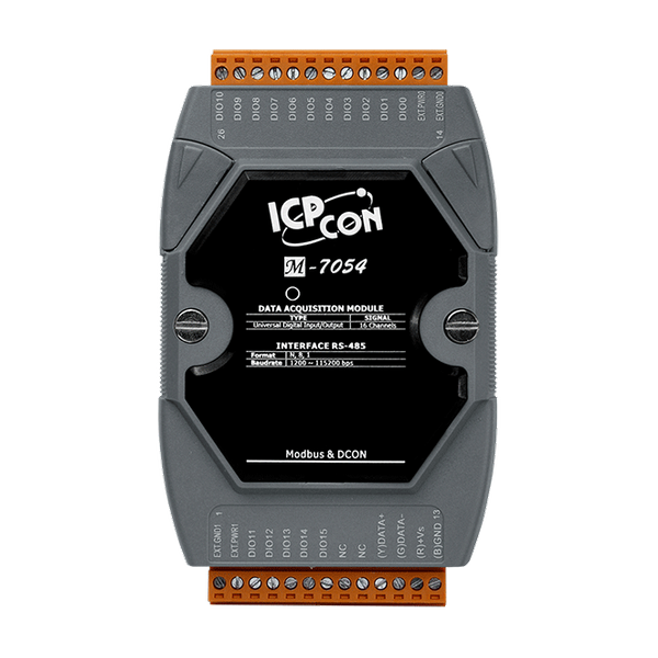 Moduł M-7054/M-7054D oferuje 16 kanałów do uniwersalnych wejść lub wyjść cyfrowych, które można wybrać przez połączenia przewodowe. Kanały wejść cyfrowych są typu dry contact i mogą być używane jako 16-bitowe liczniki, natomiast kanały wyjść cyfrowych są typu sink z ochroną przed zwarciem. Moduł M-7054D posiada 16 wskaźników LED do monitorowania statusu kanałów. M-7054(D) obsługuje protokoły Modbus RTU i DCON, które można skonfigurować za pomocą oprogramowania. Istnieją również opcje konfiguracji wartości początkowej i wartości bezpiecznej. Dodatkowo, moduł wyposażony jest w ochronę przed zakłóceniami elektromagnetycznymi: ±4 kV ESD, ±4 kV EFT oraz izolację intra-modułową 3750 VDC, co zwiększa odporność na zakłócenia w warunkach przemysłowych.