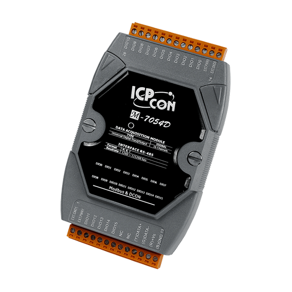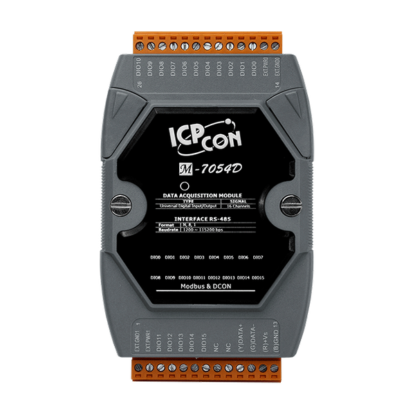 M-7054/M-7054D oferuje 16 kanałów do uniwersalnych wejść lub wyjść cyfrowych, które można wybrać poprzez podłączenie przewodów. Kanały wejść cyfrowych są stykami suchymi i mogą być używane jako liczniki 16-bitowe, podczas gdy kanały wyjść cyfrowych są typu 'sink' z ochroną przed zwarciem. M-7054D posiada 16 wskaźników LED do monitorowania statusu kanałów. M-7054(D) obsługuje protokoły Modbus RTU i DCON, które można konfigurować za pomocą oprogramowania. Istnieją również opcje konfigurowania wartości przy włączeniu i wartości bezpiecznych. Urządzenie zapewnia także ochronę przed zakłóceniami w środowisku przemysłowym dzięki ±4 kV ESD, ±4 kV EFT oraz izolacji 3750 VDC między modułami.