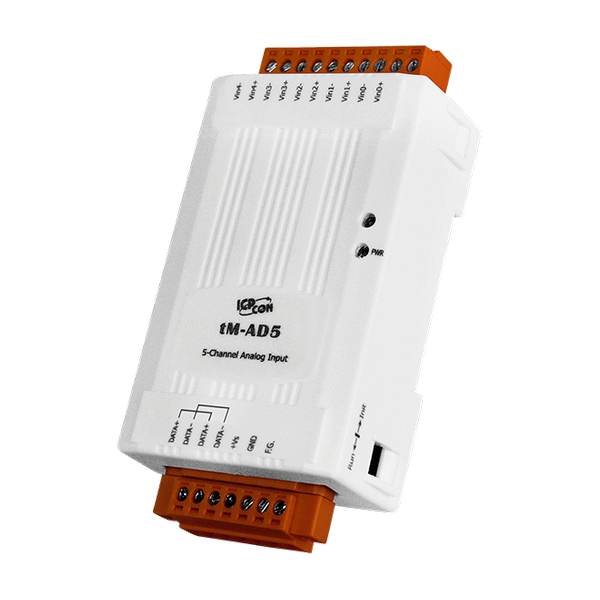Moduł tM-AD5 to moduł wejść analogowych, który zawiera 5 różnicowych kanałów wejść analogowych oraz oferuje programowalny zakres wejściowy na wszystkich wejściach analogowych (±1 V, ±2.5 V, ±5 V, ±10 V). Moduł zapewnia wysoką ochronę przed przepięciami do 120 VDC. Częstotliwość próbkowania tM-AD5 jest regulowana i dostępna w trybie szybkim lub normalnym. Moduł tM-AD5 oferuje również ochronę ESD do 4 kV oraz izolację między-modułową 2500 Vrms.