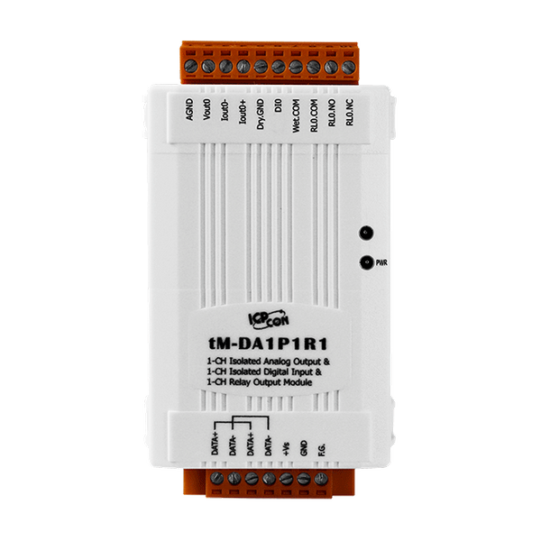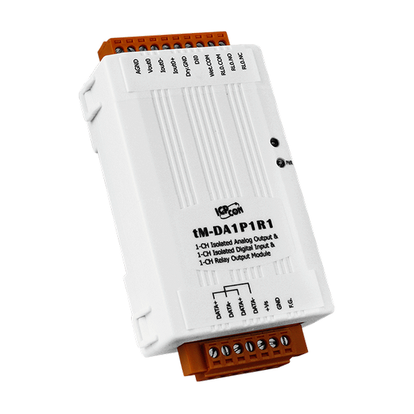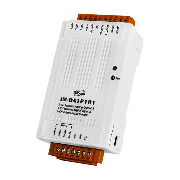 tM-DA1P1R1 jest modułem interfejsu RS-485, który oferuje 1 kanał wyjścia analogowego, 1 kanał wejścia cyfrowego oraz 1 kanał wyjścia przekaźnikowego. Rozdzielczość wyjścia analogowego wynosi 12-bit, z zakresem wyjściowym 0~10V i 0~20mA. Kanał wejścia cyfrowego to typ bezpotencjałowy, zapewniający funkcję licznika 16-bitowego. Wyjście przekaźnikowe to typ Form C. Wszystkie terminale I/O zapewniają ochronę ESD 4 kV oraz izolację między modułową 3 kV.
