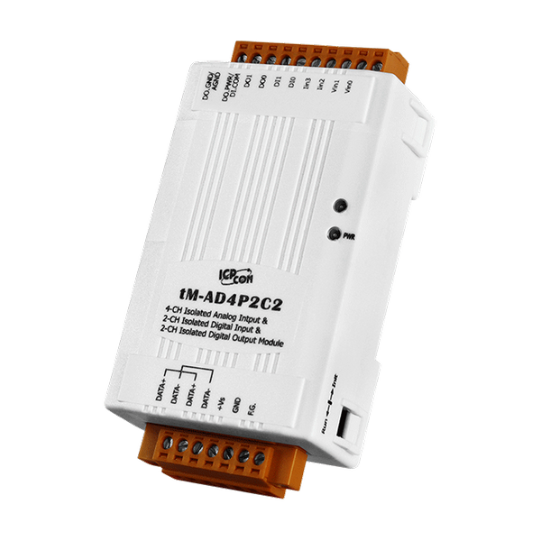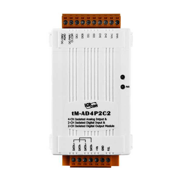 tM-AD4P2C2 to moduł wielofunkcyjny, który obejmuje 4 kanały wejść analogowych, 2 kanały wejść cyfrowych oraz 2 kanały wyjść cyfrowych. Moduł oferuje programowalne zakresy wejść analogowych, które obejmują 2 kanały wejść napięcia (±1 V, ±2,5 V, ±5 V i ±10 V) oraz 2 kanały wejść prądu (±20 mA, 0 ~ 20 mA i 4 ~ 20 mA). Wejścia analogowe zapewniają wysoką ochronę przed przepięciami do 120 VDC i regulowaną szybkość próbkowania. Moduł obsługuje wyjścia cyfrowe typu sink z ochroną przed zwarciem, a wyjścia cyfrowe mogą być używane jako alarmy limitu wejściowego napięcia. Wejścia cyfrowe są typu source i wszystkie kanały wejść cyfrowych mogą być używane jako 16-bitowe liczniki. Istnieją opcje konfigurowania wartości włączenia i wartości bezpiecznych wyjść cyfrowych. Zapewniona jest także ochrona ESD 4 kV oraz izolacja między-modułowa 2500 VDC. tM-AD4P2C2 obsługuje protokoły DCON, Modbus RTU i Modbus ASCII, które można konfigurować za pomocą oprogramowania.