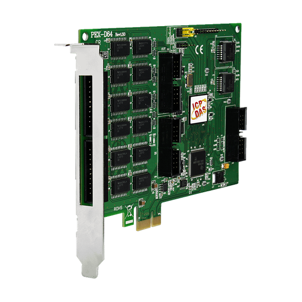 Karta PEX-D64 wspiera magistralę PCI Express. Te karty zapewniają 32 kanały DI i 32 kanały DO, składające się z dwóch 16-bitowych portów wejściowych i dwóch 16-bitowych portów wyjściowych. PEX-D64 oferuje 6 różnych liczników/timerów z czterema źródłami zegara: 2 MHz, 1 MHz, 500 kHz i 250 kHz. Użytkownik może użyć źródła zegara z padów lutowniczych. 3 z 6 liczników/timerów służą do ogólnych celów, takich jak pomiar częstotliwości, zliczanie zdarzeń i generowanie impulsów; pozostałe 3 kanały są przeznaczone do funkcji przerwań.