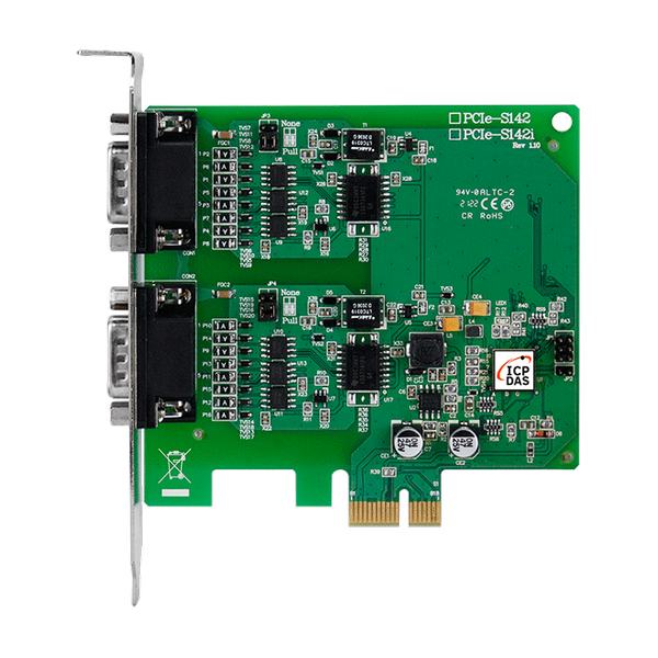 Seria kart PCIe-S142 zapewnia 2 porty szeregowe RS-422/RS-485. Układ Uart Bridge zapewnia automatyczną kontrolę kierunku danych dla sygnałów RS-485. Każdy port może być skonfigurowany jako RS-485 do komunikacji półdupleksowej lub RS-422 do komunikacji pełnodupleksowej. Obsługuje prędkości do 921600 bps i pełnodupleksową komunikację.