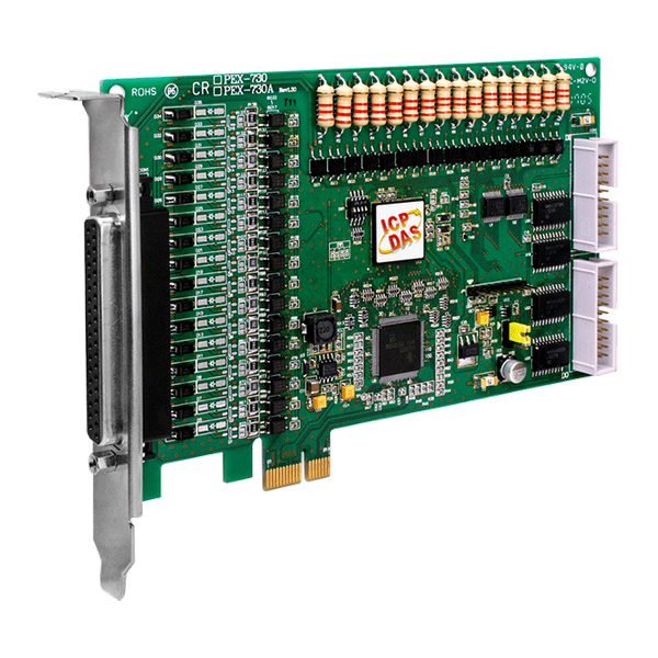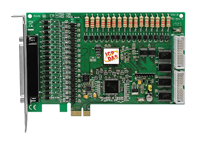 Karty PEX-730A zapewniają 32 izolowane kanały wejść/wyjść cyfrowych (16 x DI i 16 x DO) oraz 32 kanały wejść/wyjść cyfrowych na poziomie TTL (16 x DI i 16 x DO). Zarówno izolowane kanały DI, jak i DO, wykorzystują krótki optyczny tor transmisji do przesyłania sygnału elektronicznego między elementami obwodu, utrzymując je elektrycznie izolowane. Dzięki 3750 Vrms ochronie izolacyjnej te kanały DI/O pozwalają na całkowite uniezależnienie sygnałów wejściowych, co zapobiega pętlom masy i chroni komputer hosta przed szkodliwymi napięciami. Każde wyjście cyfrowe posiada tranzystor Darlingtona NPN (przyciągający prąd dla PEX-730) lub PNP (dostarczający prąd dla PEX-730A) oraz zintegrowaną diodę tłumiącą dla obciążenia indukcyjnego. Wyjścia z otwartym kolektorem (kanały DO) są zwykle wykorzystywane do powiadamiania alarmów i ostrzeżeń, sterowania wyjściem sygnału, kontroli zewnętrznych układów wymagających wyższego poziomu napięcia oraz zastosowań w transmisji sygnału itp.