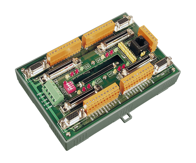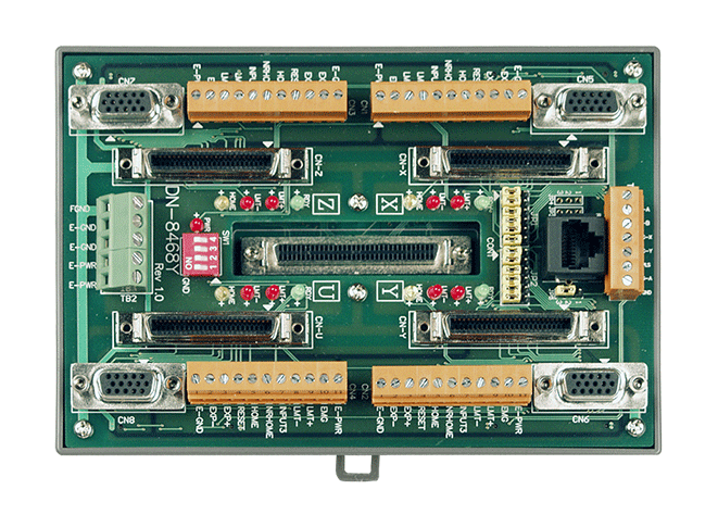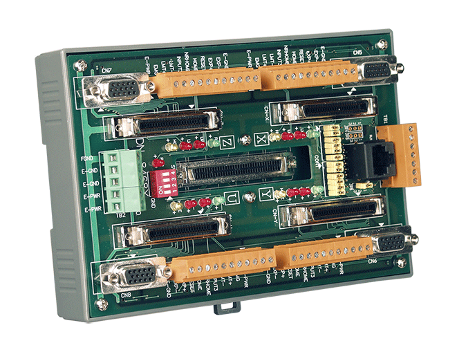 Seria DN-8468 to płyta córka zaprojektowana dla 4-osiowych kontrolerów ruchu ICP DAS, takich jak I-8094, I-8094F, I-8094A, I-8094H oraz PISO-PS400. Jest przeznaczona do różnych sterowników silników, takich jak sterowniki ogólnego zastosowania, wzmacniacze Mitsubishi i Panasonic. Jest to nie tylko płyta zaciskowa do łatwego podłączania sygnałów, ale także zapewnia izolację obwodów na płycie w celu ochrony kontrolerów. Sygnały interfejsu są podzielone na cztery grupy. Każda grupa odpowiada jednej osi i zawiera niezbędne linie wyjścia impulsowego polecenia, linie sprzężenia zwrotnego enkodera, specjalne wejścia (Home, near home, krańcówki) oraz wyjście serwo-enable. Złącza zaciskowe są wykorzystywane do łatwego okablowania. Użytkownicy mogą wymieniać złącza, aby wymienić definicję osi bez uciążliwego przekablowania. Ta płyta zawiera również moduł zasilania na płycie, który dostarcza różne napięcia dla innych układów. Moduł zasilania przyjmuje szeroki zakres napięć wejściowych (20 ~ 26 VDC).