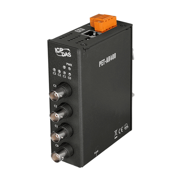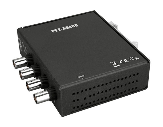 PET-AR400 to szybkie urządzenie do akwizycji danych z wbudowanym portem komunikacyjnym Ethernet do przesyłania danych przez sieć, oraz zawiera 4 szybkie 24-bitowe różnicowe kanały wejściowe IEPE (128 kHz sample-and-hold przy jednym kanale).