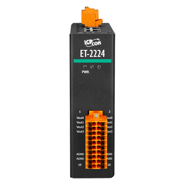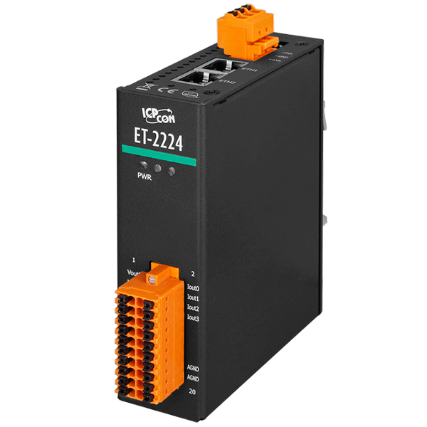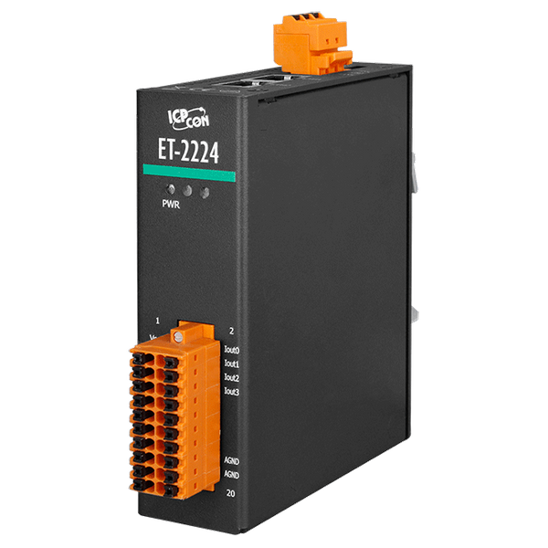 ET-2224 to 4-kanałowy moduł wyjścia analogowego, który oferuje różne programowalne zakresy wyjść, w tym 0 ~ 5 V, ±5 V, 0 ~ 10 V, ±10 V, 4 ~ 20 mA i 0 ~ 20 mA. Zapewnia on konfigurowalne wartości uruchomieniowe AO oraz ustawienia wartości bezpiecznych, jak również wykrywanie otwartego obwodu dla każdego kanału wyjścia 4 ~ 20 mA. Moduł posiada wbudowany 2-portowy przełącznik Ethernet, umożliwiający topologię łączenia w łańcuch (Daisy-Chain). Funkcja ta oferuje elastyczność w konfiguracji urządzeń, upraszcza instalację i redukuje koszty infrastruktury. Dodatkowo moduł zapewnia ochronę EMS (EFT/ESD/Surge) oraz izolację I/O 3000 VDC, co zwiększa odporność na zakłócenia w środowiskach przemysłowych.