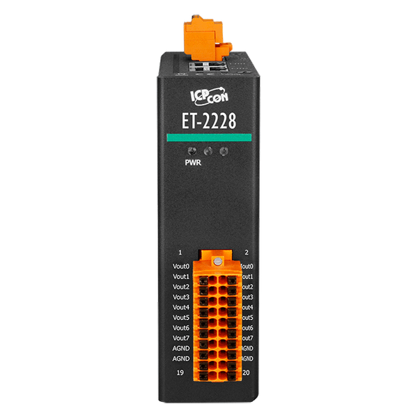 ET-2228 to 8-kanałowy moduł wyjść analogowych. Moduł oferuje różnorodne programowalne zakresy wyjściowe, w tym 0 ~ 5 V, +/-5 V, 0 ~ 10 V, +/-10 V, 4 ~ 20 mA i 0 ~ 20 mA. Oferuje konfigurowalne ustawienia wartości początkowej AO oraz wartości bezpiecznej, jak również wykrywanie otwartego obwodu dla każdego kanału wyjścia 4 ~ 20 mA. Moduł zawiera wbudowany 2-portowy przełącznik Ethernet, ułatwiający topologię łańcuchową (daisy-chain). Ta funkcja oferuje elastyczność w konfiguracji urządzeń, upraszcza instalację i zmniejsza koszty infrastruktury. Dodatkowo, moduł zapewnia ochronę EMS (EFT/ESD/Surge) oraz izolację I/O 3000 VDC w celu wzmocnienia ochrony przed zakłóceniami w środowiskach przemysłowych.