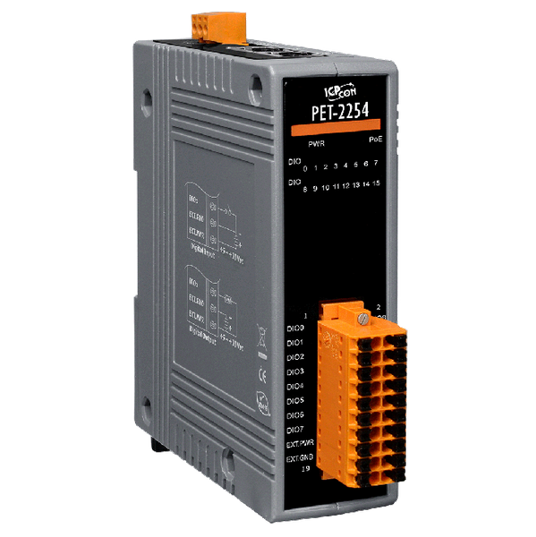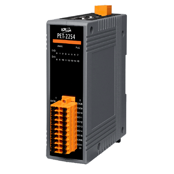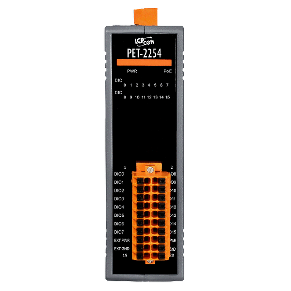 PET-2254 to 16-kanałowy uniwersalny moduł DIO. Każdy kanał można ustawić jako wejście cyfrowe lub wyjście za pomocą okablowania, a każde wyjście może obsługiwać obciążenie 100 mA. Moduł posiada wbudowany 2-portowy przełącznik Ethernet, co umożliwia okablowanie w topologii daisy-chain. Ta funkcja oferuje elastyczność konfiguracji urządzeń, upraszcza instalację i redukuje koszty infrastruktury. Dodatkowo moduł oferuje ochronę EMS (EFT/ESD/Surge) oraz izolację I/O 3000 VDC, co zwiększa zdolność ochrony przed zakłóceniami w środowiskach przemysłowych. Pozwala także na ustawienie wartości początkowej oraz wartości bezpiecznej dla wyjścia cyfrowego.