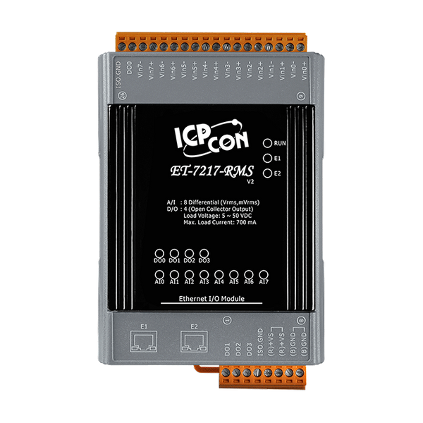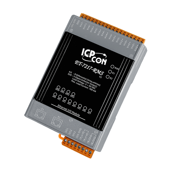 ET-7217RMS to moduł z 8-kanałowym różnicowym wejściem AC i 4-kanałowymi wyjściami cyfrowymi, służący do konwersji sygnałów wejściowych AC na ich wartości True RMS DC. Zakres wejściowy RMS może wynosić od +150 mVrms do +10 Vrms, a każdy kanał może być konfigurowany indywidualnie. ET-7217RMS to kompletny, wysokiej dokładności przetwornik RMS-DC, który oblicza wartość True RMS DC dowolnej złożonej fali. Posiada także ochronę ESD do 4 kV, izolację wewnętrzną 2500 VDC oraz ochronę przed przepięciami ±35 Vrms/±28 VDC.