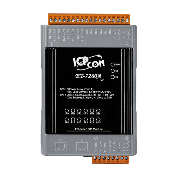 ET-7260A oferuje pełne możliwości sieciowe oraz różnorodne funkcje I/O, wraz z serwerem interfejsu użytkownika opartym na WWW, co umożliwia łatwą konfigurację. ET-7260A może być zdalnie sterowany przy pomocy protokołu Modbus TCP/UDP, co pozwala na jego pełną integrację z systemami HMI, SCADA, PLC oraz innymi systemami sterowania przemysłowego.