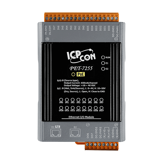 Moduł PET-7245 oferuje 16 kanałów wyjść cyfrowych typu "source". Posiada on optyczną izolację dla ochrony przed przelotnym przepięciem do 3750 VDC, jednak nie ma izolacji między kanałami. Wartości początkowe i bezpieczne dla kanałów wyjść cyfrowych są programowalne. W niektórych zastosowaniach przemysłowych użytkownik może podłączyć kanały wyjściowe PET-7245 do modułu przekaźnikowego serii RM w celu przełączania obciążeń indukcyjnych.