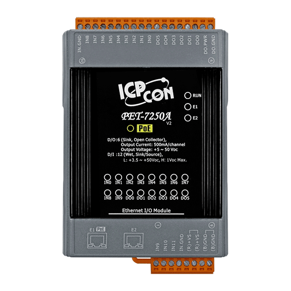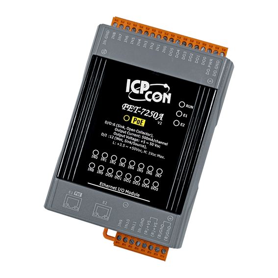 Seria ET-7000/ET-7200 oferuje pełne możliwości sieciowe oraz różnorodne funkcje I/O, wraz z modułami monitorowania i sterowania Ethernet I/O opartymi na sieci WWW, co oznacza, że moduły mogą być zdalnie sterowane za pomocą protokołu Modbus TCP/UDP przez sieć Ethernet. To zapewnia, że seria ET-7000/ET-7200 jest zintegrowana z systemami HMI, SCADA, PLC i innym oprogramowaniem do sterowania przemysłowego. PET-7250A wspiera specyfikacje IEEE 802.3af Power-Over-Ethernet (Class 1). Poprzez połączenie z urządzeniami sieciowymi, które wspierają standard IEEE 802.3af PoE, zasilanie może być dostarczane przez miedziany kabel Ethernet. PET-7250A posiada dwa wbudowane porty switch Ethernet, co pomaga zredukować koszty implementacji, ponieważ nie ma potrzeby instalowania dodatkowego switcha w celu łańcuchowego połączenia portów lub rozbudowy sieci przez linię Ethernet. PET-7250A oferuje 6 wyjść cyfrowych typu sink oraz 12 wejść cyfrowych typu wet contact, z których każde może być używane jako licznik 32-bitowy. Dodatkowo, każde wejście cyfrowe PET-7250A akceptuje zarówno dry contact, jak i wet contact.