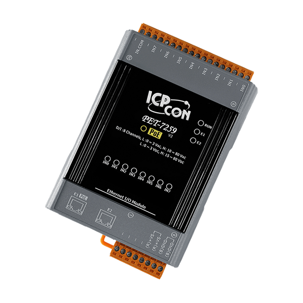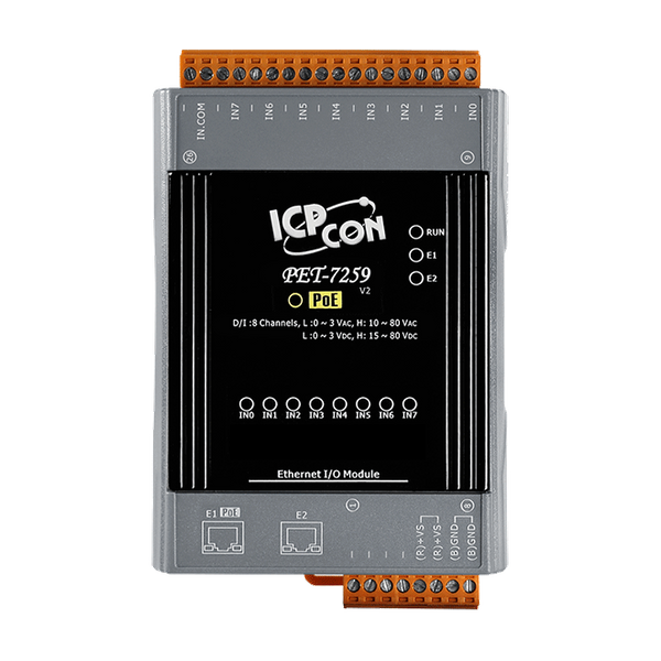 PET-7259 oferuje 8 cyfrowych wejść AC/DC. Każde wejście może być używane jako 32-bitowy licznik. Urządzenie posiada izolację optyczną zapewniającą ochronę przed przejściowym przepięciem do 2500 VDC, ale nie zapewnia separacji kanałów. Może być bezpiecznie używane w aplikacjach, gdzie występują niebezpieczne napięcia.Zastosowania