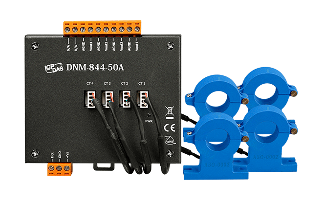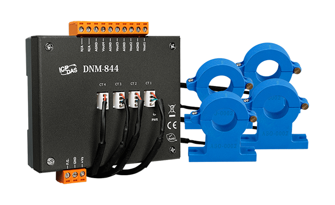 DNM-844 to 4-kanałowy przekładnik prądowy. Maksymalny zakres wejściowy prądu wynosi od ±2000 A i może być stłumiony do ±10 V. Zapewnia izolację 3000 V DC między modułami. Może być używany z modułami wejść analogowych, takimi jak I-7017, I-87017, M-7017RMS i I-87017W-RMS do pomiaru wysokiego prądu.