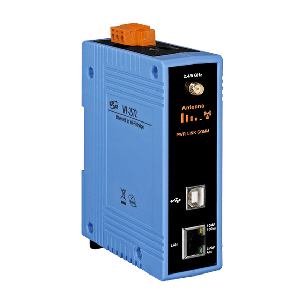 WF-2572 to przemysłowy mostek Ethernet na Wi-Fi. Urządzenie wymaga jedynie podłączenia kabla Ethernet do WF-2572, aby utworzyć bezprzewodową sieć osobistą IEEE 802.11 a/b/g/n. Interfejs między Ethernet a Wi-Fi korzysta z transparentnej transmisji, dzięki czemu można konwertować Wi-Fi na internet przewodowy bez złożonych ustawień. WF-2572 obsługuje również dwa pasma (2,4/5 GHz). Pasmo 2,4 GHz jest bardziej zatłoczone niż 5 GHz. Dlatego urządzenia w paśmie 2,4 GHz są bardziej narażone na zakłócenia niż te w paśmie 5 GHz. WF-2572 będzie mniej podatny na zakłócenia w paśmie 5 GHz.