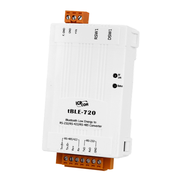 Moduł tBLE-720 jest przeznaczony do sieci szeregowych takich jak RS-232, RS-422 lub RS-485. Umożliwia konwersję interfejsu RS-232, RS-422 lub RS-485 na sieć piconet Bluetooth Low Energy (LE). Użytkownik może wybrać tBLE-720 lub urządzenie mobilne (np. smartfon, tablet lub notebook) do połączenia, co umożliwia konwersję danych Bluetooth LE między dwoma urządzeniami. Moduł tBLE-720 ma dwa tryby transmisji – tryb reklamowy i tryb połączenia. Użytkownicy mogą nie tylko wysyłać pakiety reklamowe w trybie reklamowym, ale także pakiety połączeniowe w trybie połączenia. Obsługuje różne role w każdym trybie transmisji. W trybie reklamowym są nadawca i obserwator, a w trybie połączenia – centralny i peryferyjny. Użytkownik może zmieniać tryb transmisji i rolę za pomocą przełącznika dip. tBLE-720 obsługuje wiele przydatnych poleceń AT, które pozwalają ustawić wiele parametrów, takich jak parametry połączenia, parametry emisji. tBLE-720 zapewnia również mechanizm ochrony niewolnika, który blokuje nieautoryzowanych masterów, a niewolnik ignoruje żądania połączenia od nieautoryzowanych masterów. Dodatkowo, ICPDAS dostarcza narzędzie programowe do łatwej konfiguracji i testowania modułów tBLE-720 za pośrednictwem interfejsów RS-232, RS-422 lub RS-485.