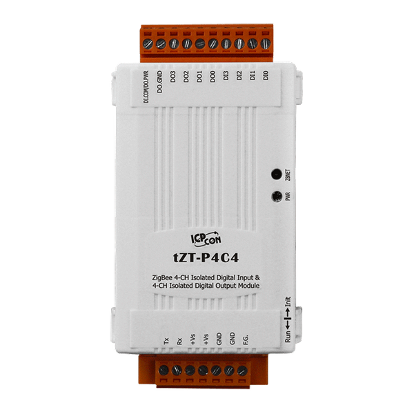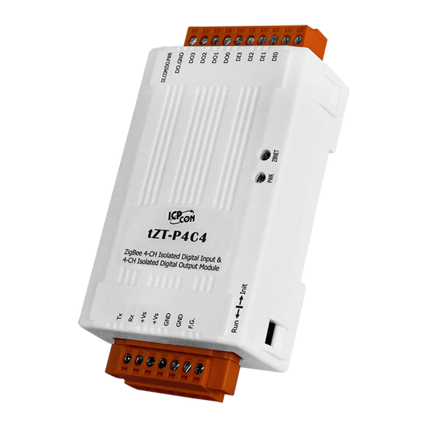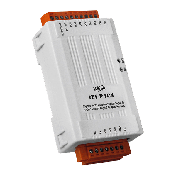 Moduł tZT-P4C4 oferuje 4 kanały wejścia cyfrowego oraz 4 kanały wyjścia cyfrowego, każdy z nich cechuje się izolacją fotoogniwową. tZT-P4C4 obsługuje wyjścia typu sink z ochroną przed zwarciami, natomiast wejścia są typu source. Wszystkie kanały wejściowe mogą być używane jako liczniki 16-bitowe. Istnieją opcje konfigurowania wartości włączenia i wartości bezpiecznych wyjść cyfrowych. Zapewnia również ochronę ESD 4 kV oraz izolację wewnętrzną modułu 3750 VDC. Produkty serii tZT ICP DAS charakteryzują się niskimi kosztami i niskim zużyciem energii w technologii ZigBee. Oferują możliwość komunikacji bezprzewodowej do 300 metrów (LOS) standardowej odległości transmisji. Dzięki dynamicznej sieci mesh, użytkownicy mogą łatwo zbierać dane DIO w trudnych do okablowania środowiskach.