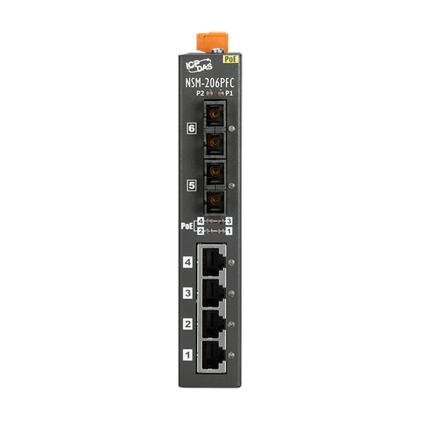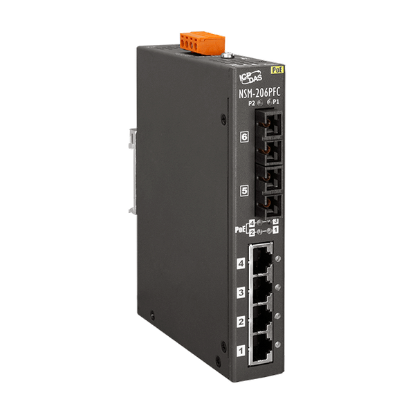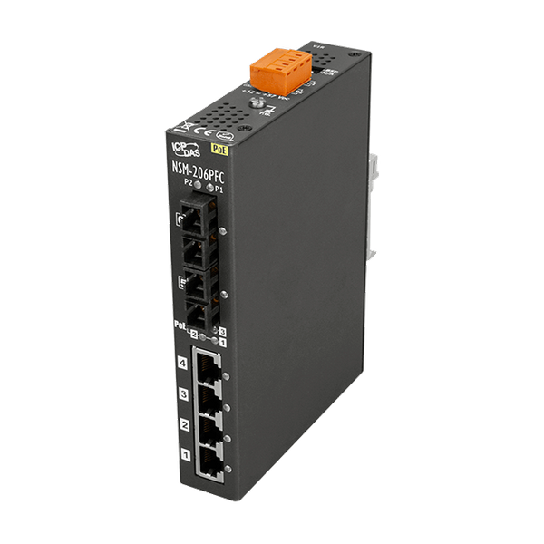 NSM-206PFC to 6-portowy niezarządzany switch Ethernet wspierający zasilanie Power-over-Ethernet na portach 1 do 4. Switch ten jest klasyfikowany jako urządzenie źródłowe zasilania (PSE), co umożliwia scentralizowanie zasilania, dostarczając do 30 watów. NSM-206PFC może być używany do zasilania urządzeń zgodnych ze standardem IEEE 802.3af/at (PD).