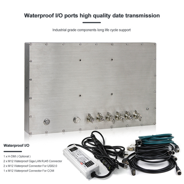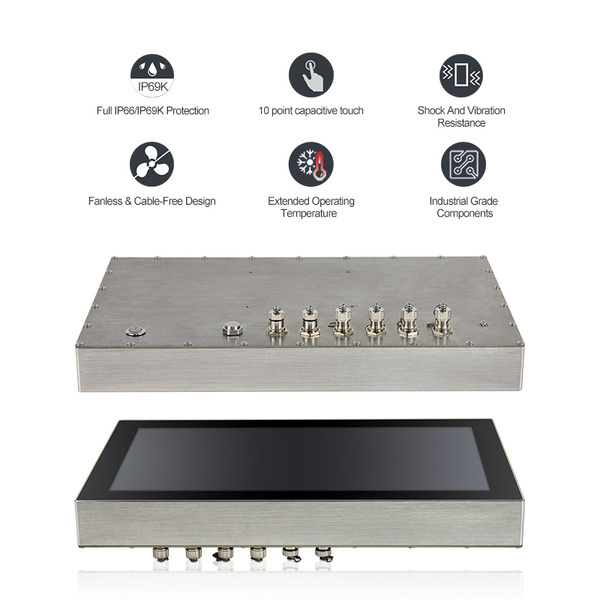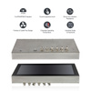 Przemysłowy komputer panelowy wykonany ze stali nierdzewnej SUS304/316 o klasie szczelności IP66/IP69K, wyposażony w 15,6-calowy ekran Full HD (1920x1080) z technologią optical bonding i dotykiem PCAP, zapewniającym wysoką precyzję obsługi. Napędzany procesorem 12. generacji Intel® Core™ i3 lub i5, obsługuje do 64 GB pamięci DDR5 RAM oraz dysk M.2 SSD od 128 GB do 2 TB. Urządzenie posiada porty 2x GbE LAN, 2x USB 2.0, COM, slot SIM, a także szeroki zakres temperatur pracy od -20°C do 70°C oraz zasilanie 9V–36V DC z zabezpieczeniami OVP/OCP/RPP, co czyni je idealnym rozwiązaniem do wymagających zastosowań przemysłowych.